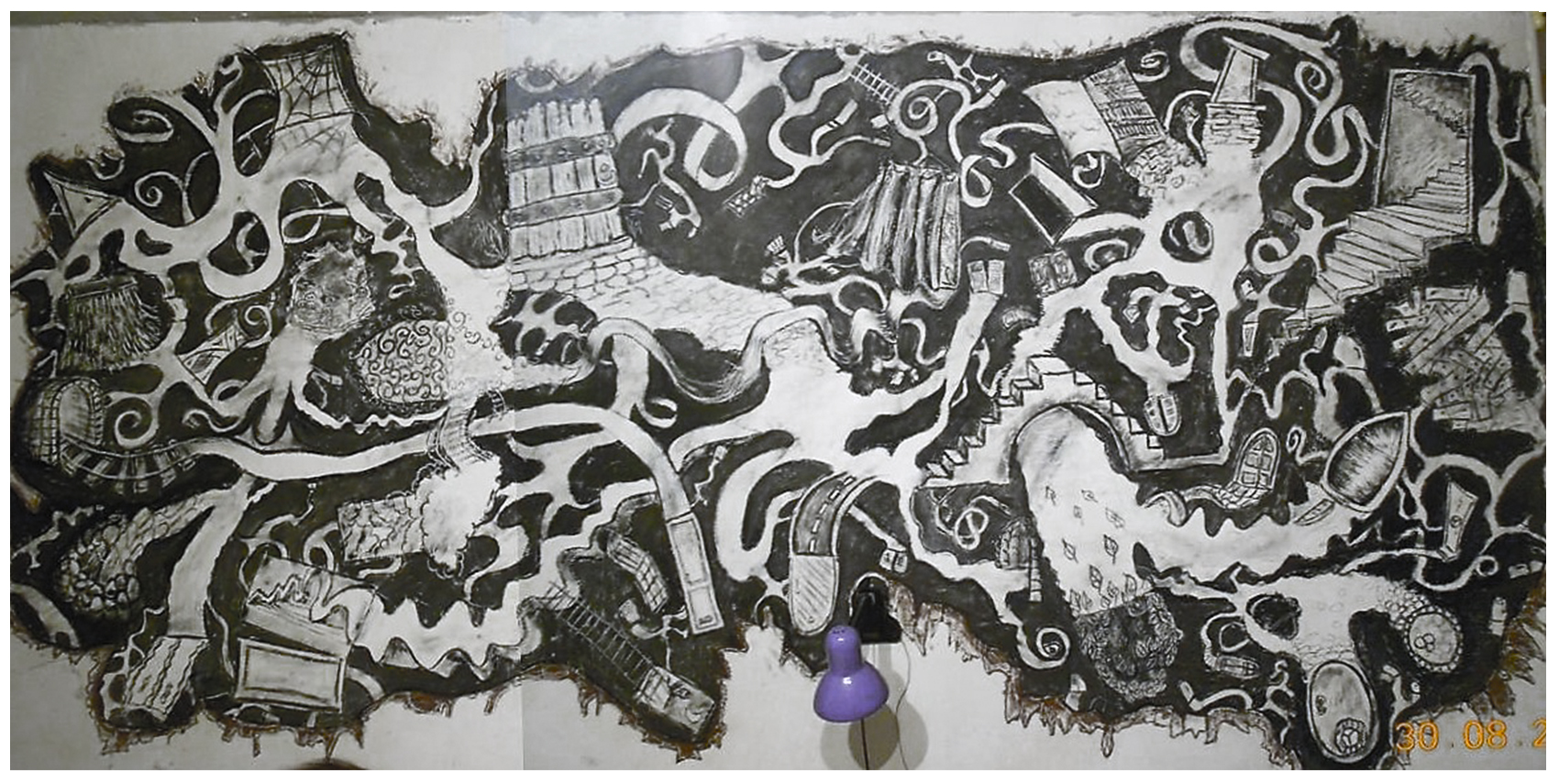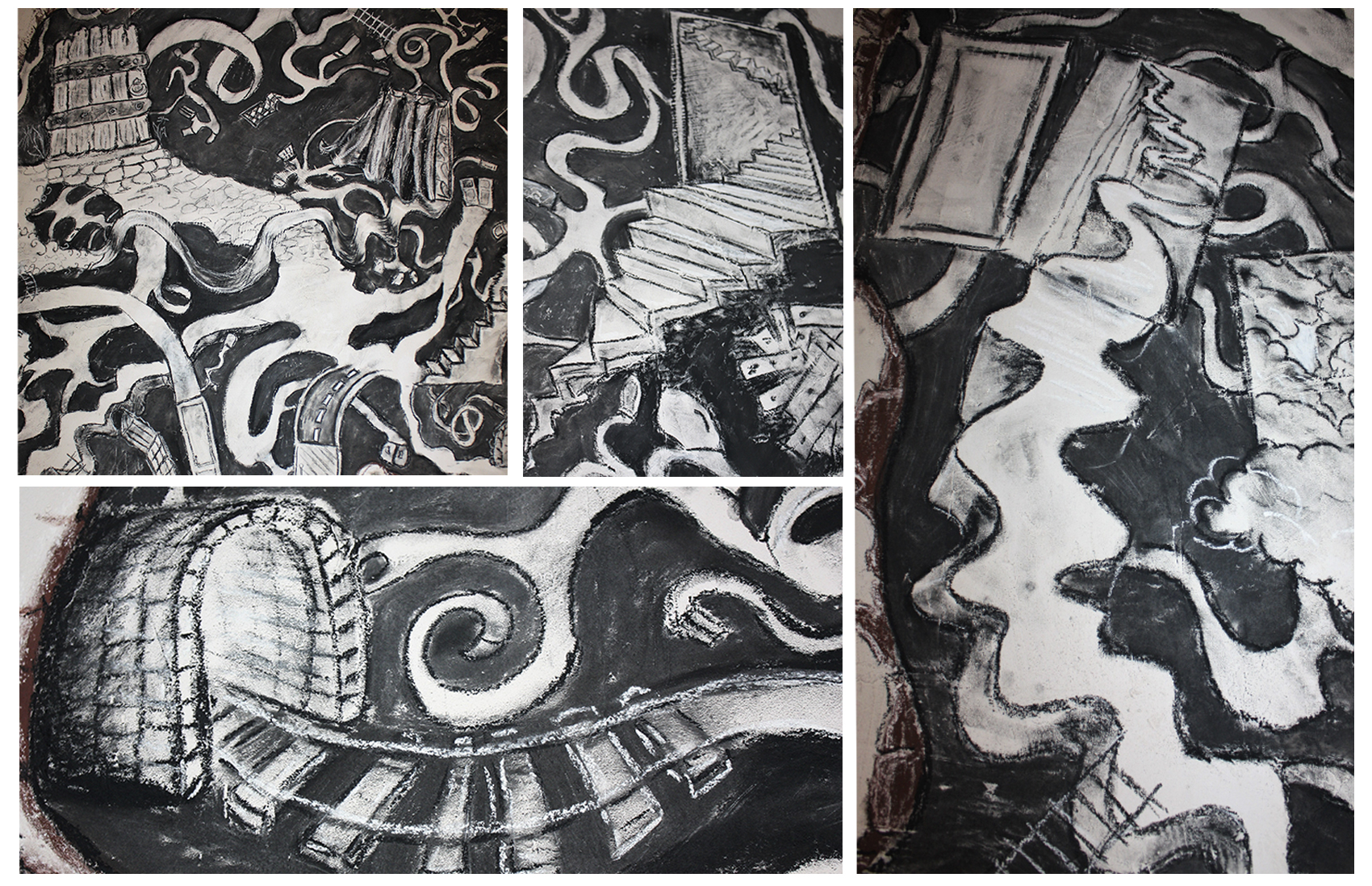 "Дороги в разные миры", настенная роспись. Уголь, соус, мел. Фрагменты.